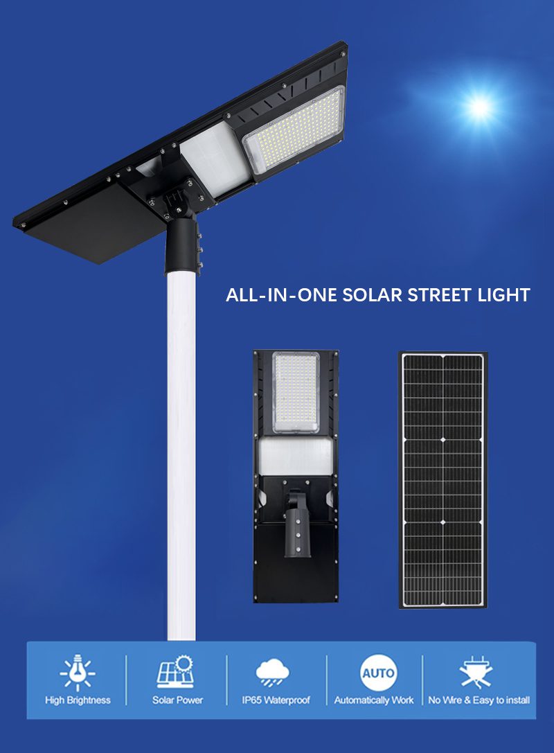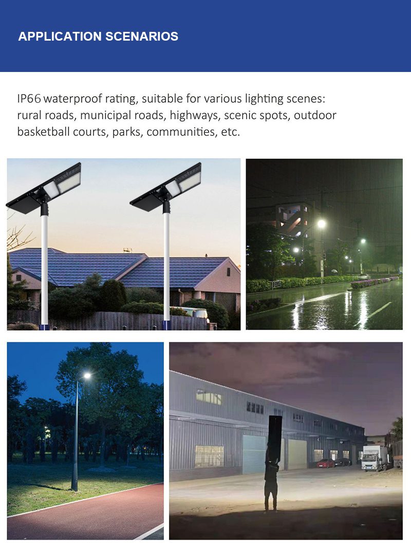 | 60w | 18V/100W Monocrystalline silicon | 1298*394*143mm | 12.8V/36AH LiFePo4 | 5050/5054SMD chips 2W*200pcs | Height 7-10m |