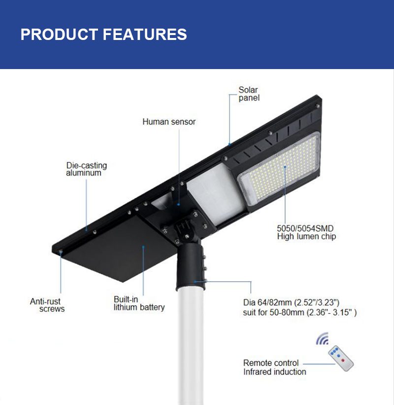 | 60w | 18V/100W Monocrystalline silicon | 1298*394*143mm | 12.8V/36AH LiFePo4 | 5050/5054SMD chips 2W*200pcs | Height 7-10m |