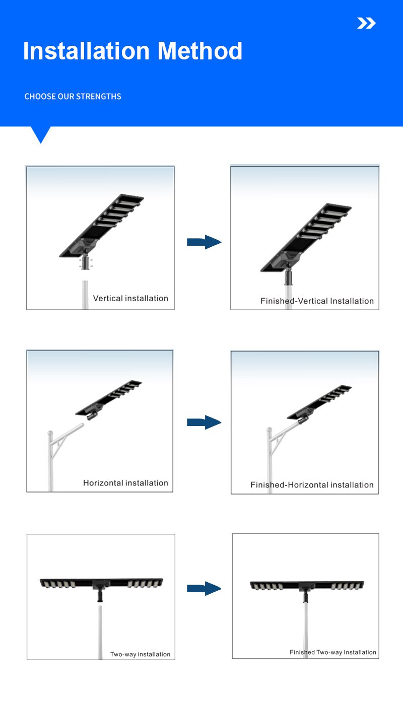 | 80w | 18V/100W Monocrystalline silicon | 1420*420*240MM | 12.8V/42AH LiFePo4 | SMD5050, 56PCS*4 | 9000lm Max. | Height 6-8m |