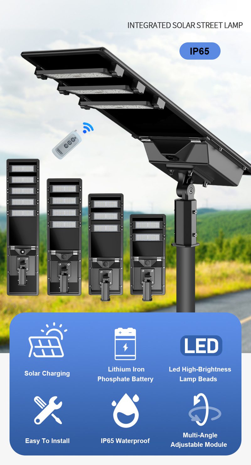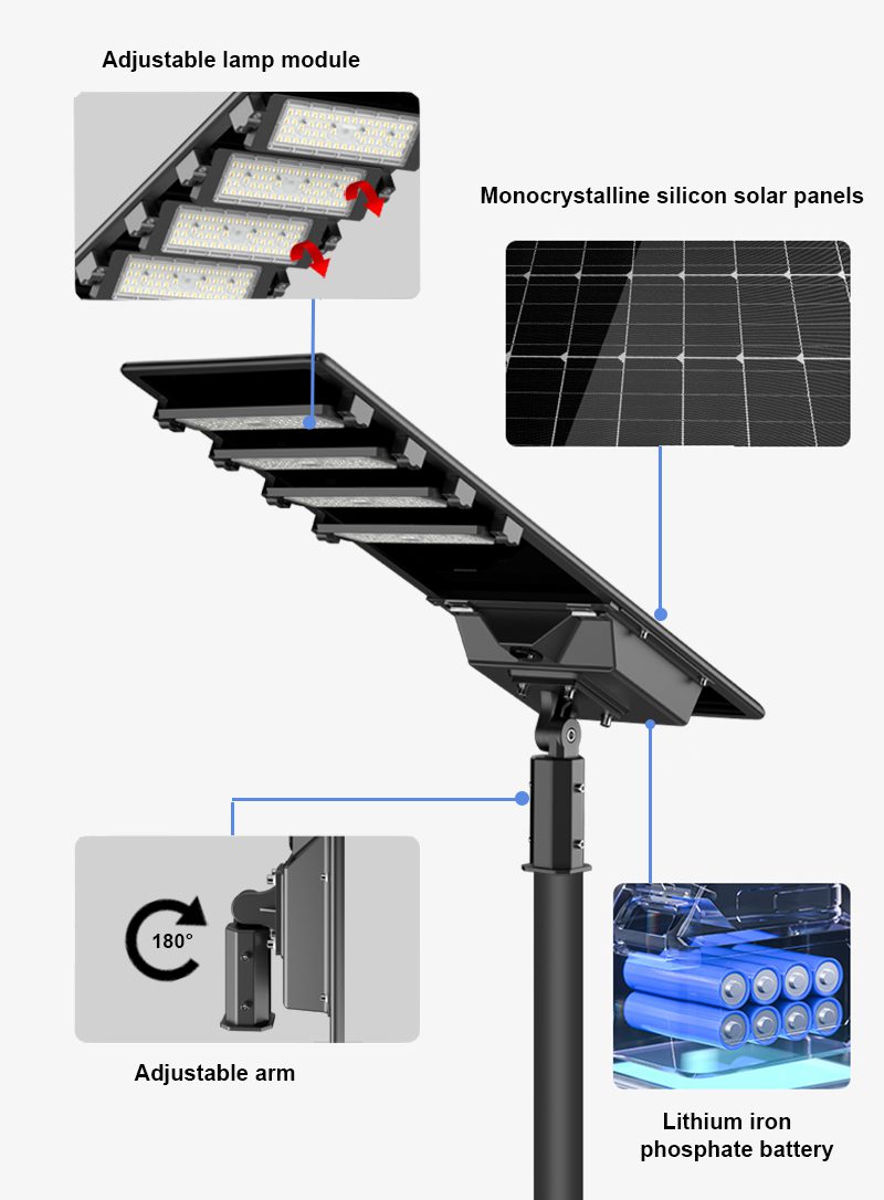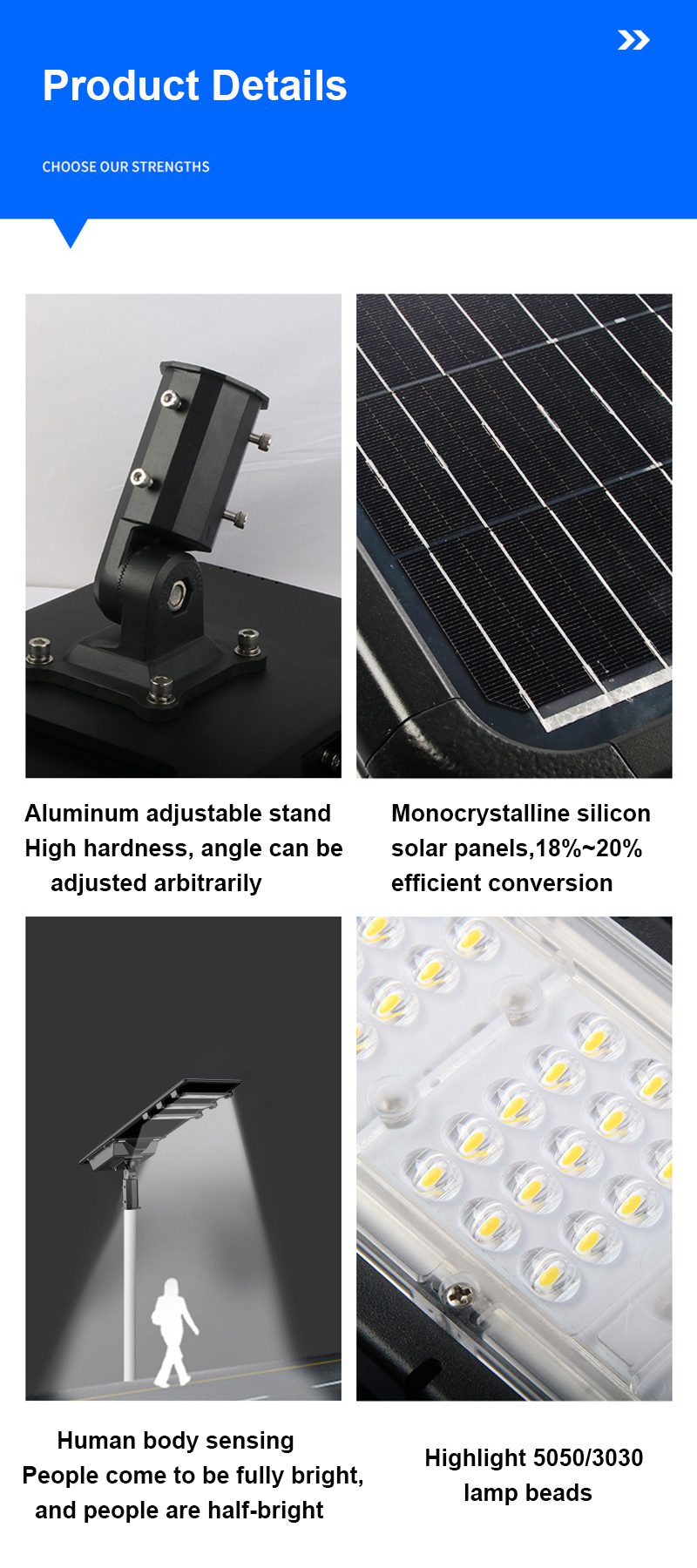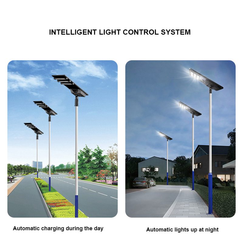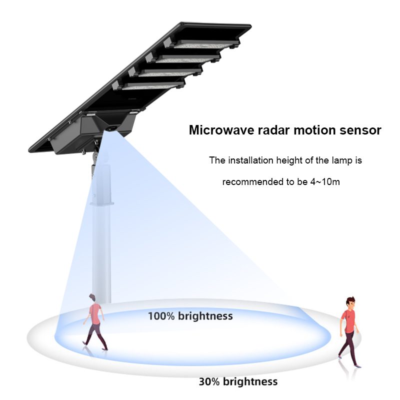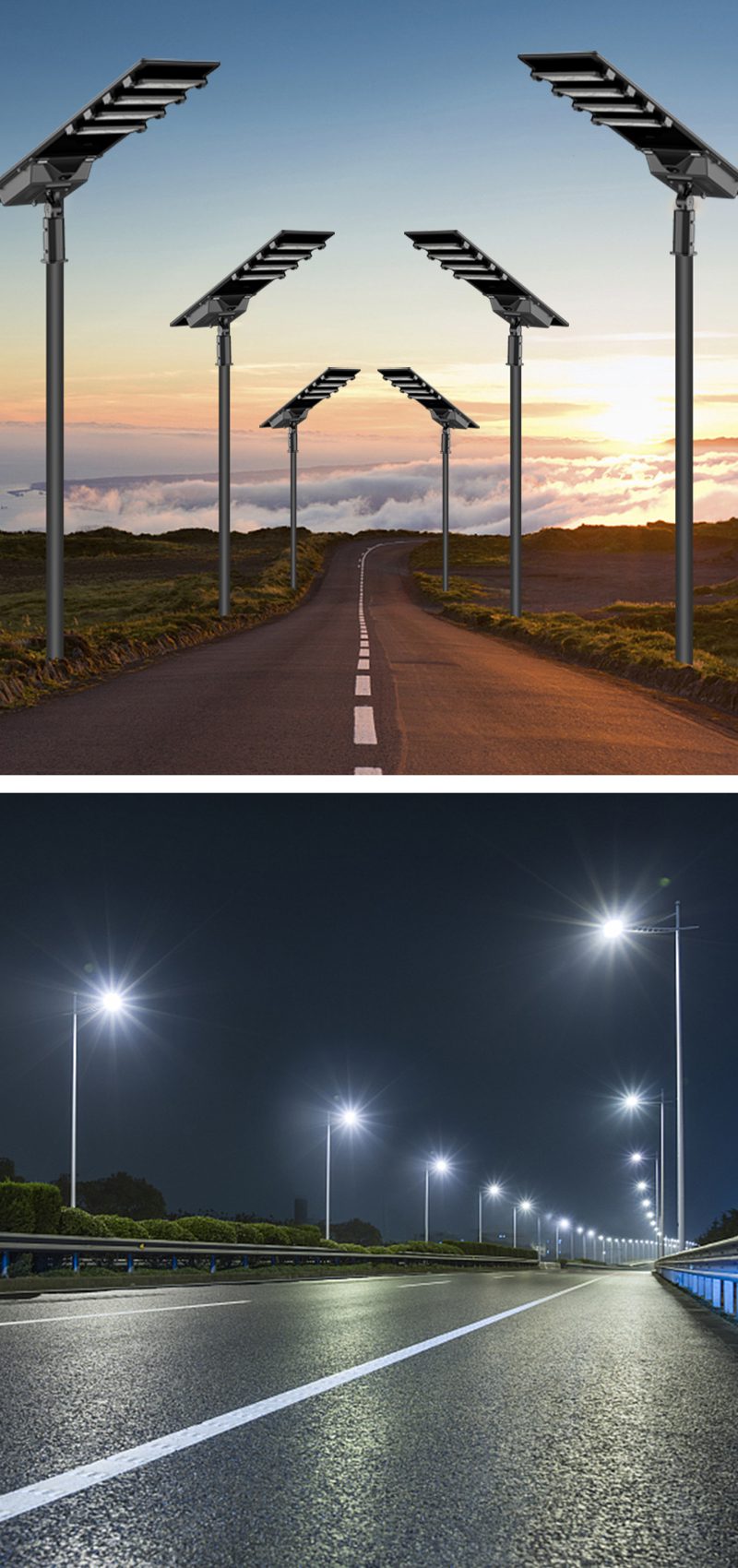 | 100w | 18V/120W Monocrystalline silicon | 1770*420*240MM | 12.8V/48AH LiFePo4 | SMD5050, 56PCS*5 | 11000lm Max. | Height 8-10m |