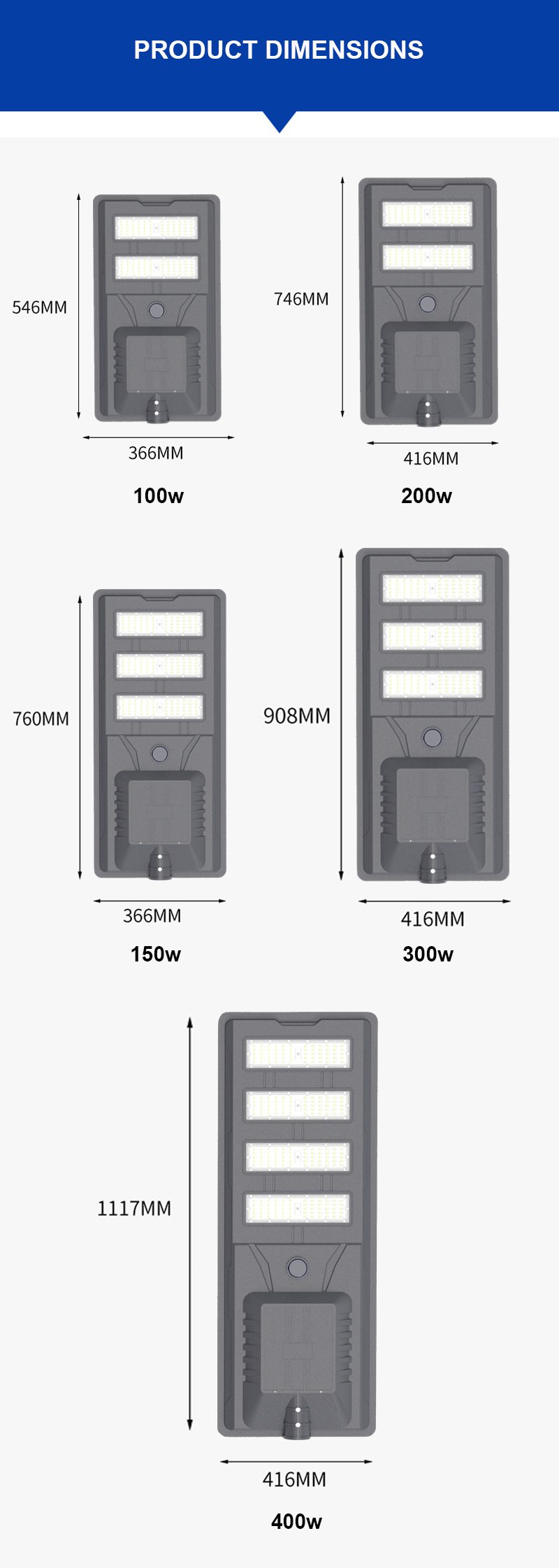 | 400w | 4 modules | 5V/80W Monocrystalline silicon | 3.2V/90AH LiFePo4 Lithium battery | 5050SMD chips 256pcs | 1117*416*88MM |