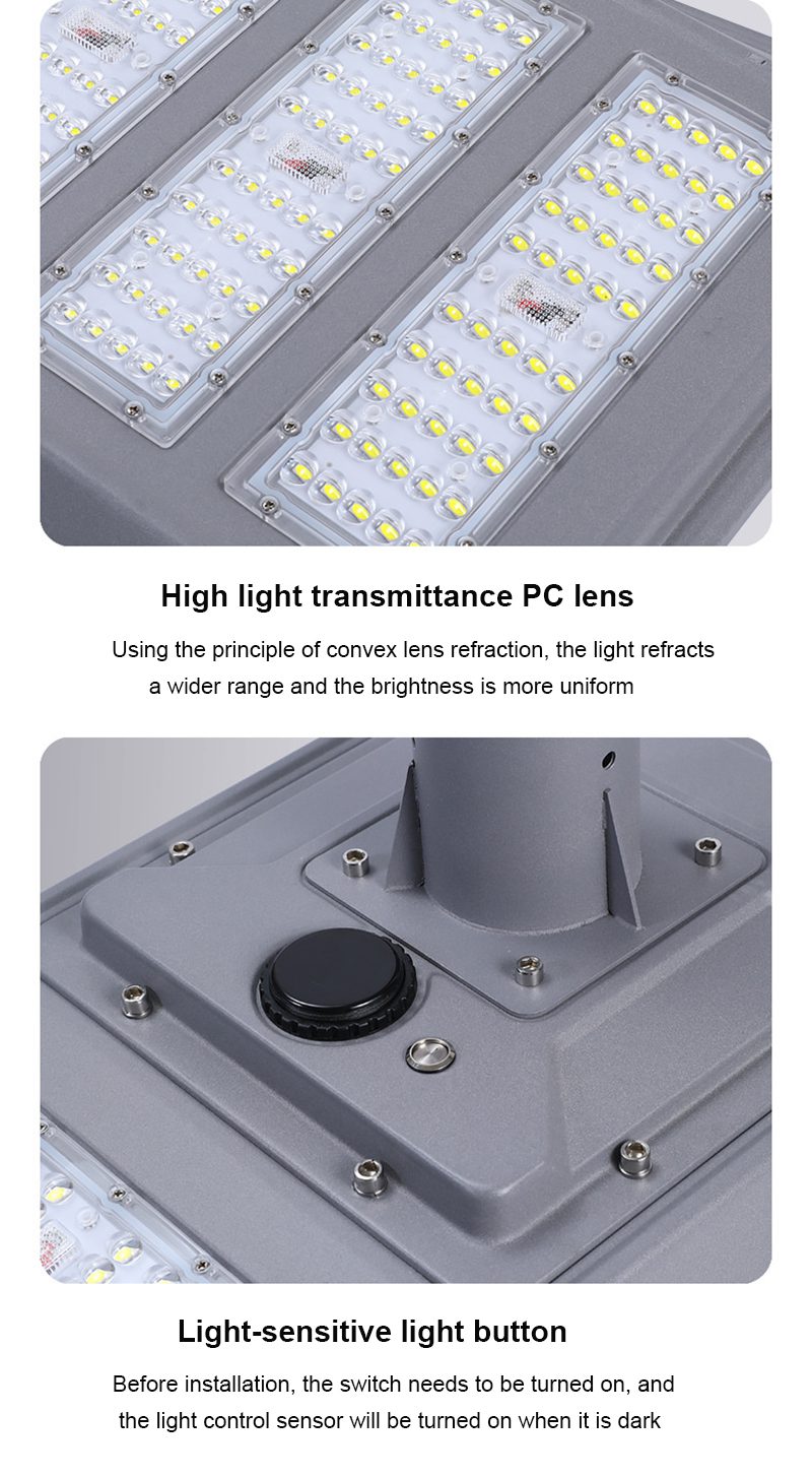 | UNK-XH402 | 18V/70W Monocrystalline silicon | 3.2V/90AH LiFePo4 Lithium battery | 3030/5050SMD chips 200pcs | 6300LM±5% | 902*402*220MM |