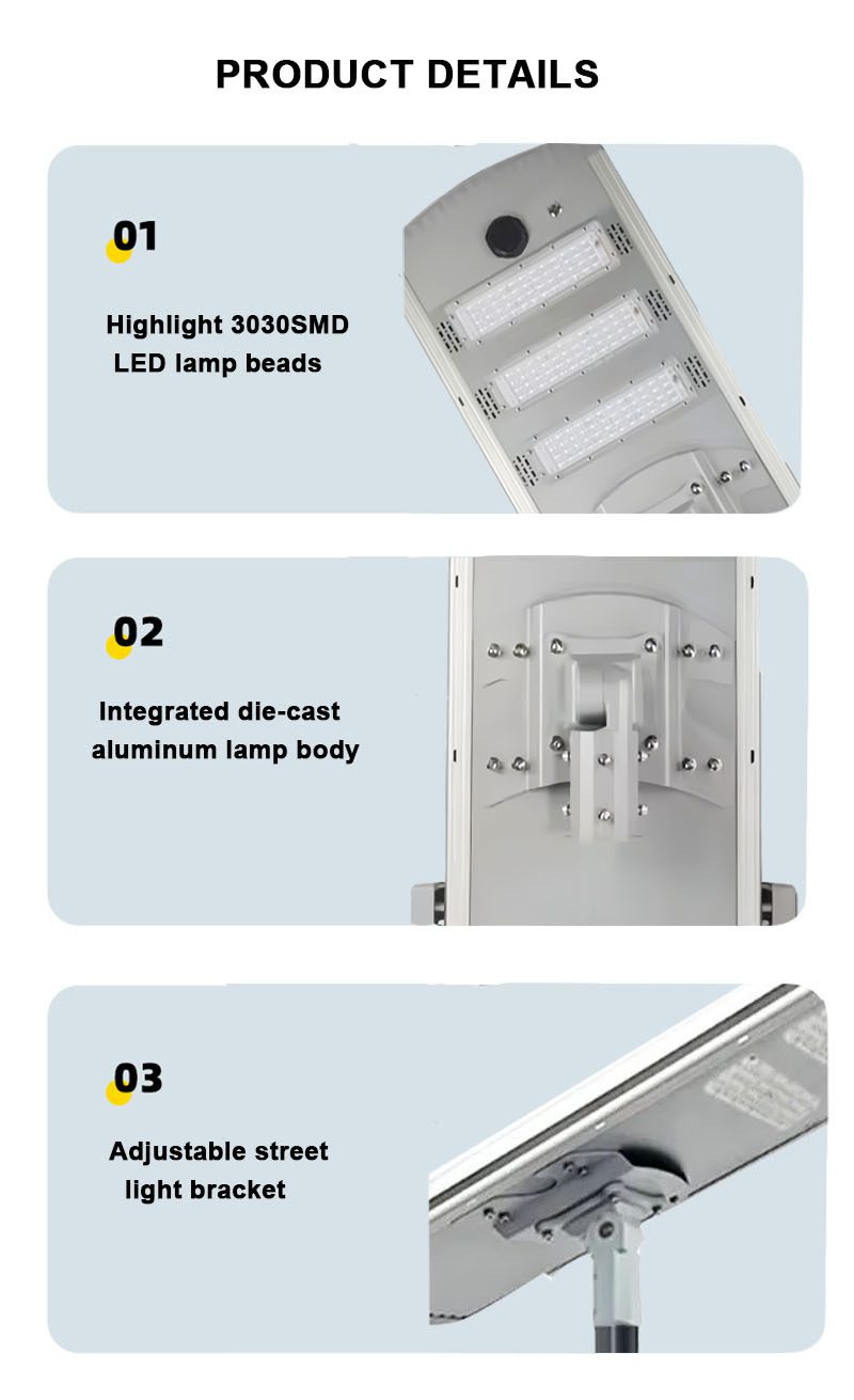 | 30w | 3 modules | 18V/60W Monocrystalline silicon | 3.2V/72AH LiFePo4 Lithium battery | 4950LM±5% | 5-6m | 1233*373*50MM |