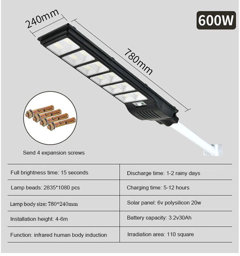 | 600w | 6V 20W Polycrystalline silicon | 3.2V/20000mAH LiFePo4 | 1080pcs 2835SMD LED | 4-6 m | 110m² |