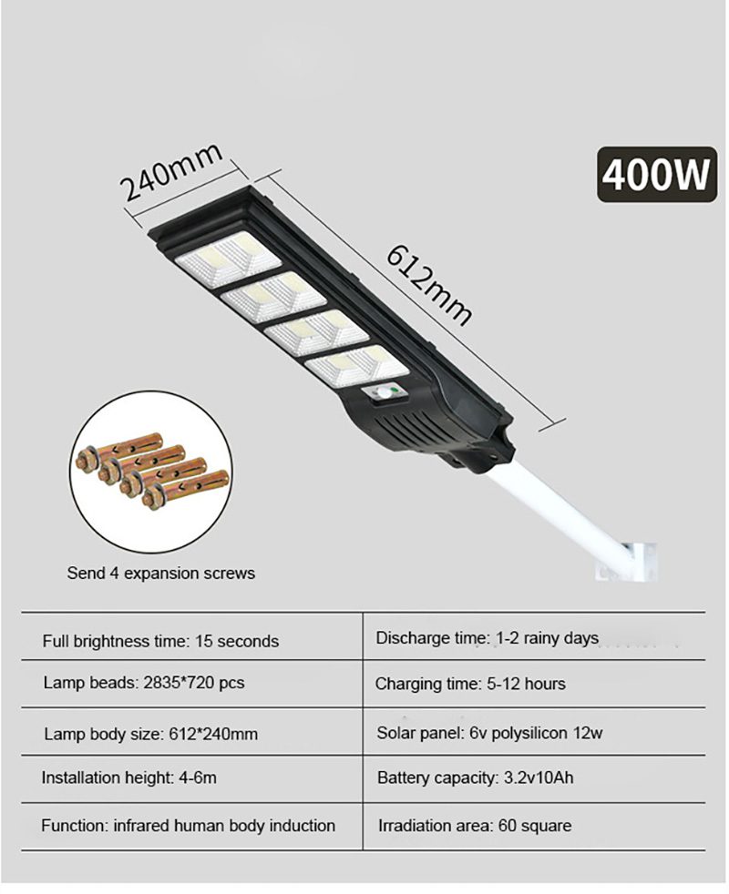 | 400w | 6V 12W Polycrystalline silicon | 3.2V/10000mAH LiFePo4 | 720pcs 2835SMD LED | 4-6 m | 60m² |